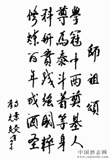 “學冠中西奠基人,尊為泰斗著等身。科研實踐強國粹,修煉百年成酒圣。”這是二鍋頭酒第八代非遺傳承人高景炎先生和原茅臺集團董事長季克良先生在恩師秦含章先生109歲生日賀壽時親筆題的一首詩,這首《師祖頌》不僅生動刻畫了“酒界泰斗”秦含章先生的經歷、成就和榮譽,更飽含了高景炎先生和季克良先生對恩師秦含章先生的崇敬之情,以及對其諄諄教誨的感恩之情。